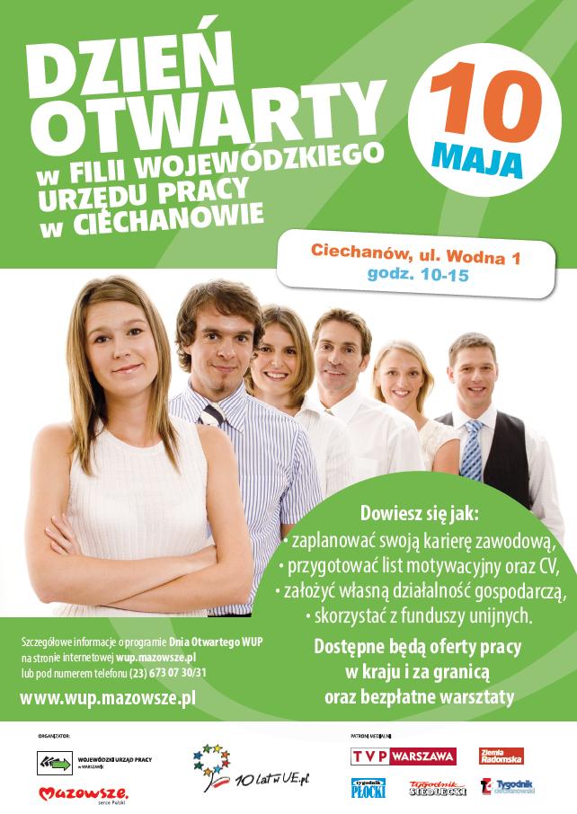 Zapraszamy mieszkañców powiatu ¿uromiñskiego, w tym osoby bezrobotne i poszukuj±ce pracy do uczestnictwa w Dniu Otwartym zorganizowanym w sobotê 10 maja 2014 roku, w Filii Wojewódzkiego Urzêdu Pracy w Ciechanowie.